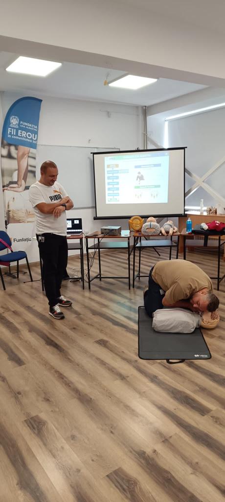 Lucrând cu copii zi de zi și fiind motivați de dorința de a fi pregătiți să îi ajute în orice situație, educatori, învățători, profesori și personal auxiliar s-au înscris la cursurile de prim ajutor organizate în județul Argeș în cadrul proiectului „Fii EROU în comunitatea ta!”, desfășurat de Fundația Leul Albastru cu sprijinul Fundației Orange. Printr-o curriculă ce respectă recomandările Consiliului European al Resuscitării, trainerii acreditați au realizat predarea în patru pași, cu scopul întipăririi și consolidării informației. Cadrele didactice au învățat în prima parte a cursului să acorde primul ajutor victimelor ce suferă un stop cardio-respirator pentru copil, adult și în situații speciale (bebeluș, gravidă, înecat) atât în prezența cât și în absența unui defibrilator automat extern. După ce au ascultat cu atenție informațiile privind cauzele stopului cardio-respirator și importanța intervenției rapide, cursanții au urmărit trainerii executând secvența corectă a manevrelor de resuscitare cardiopulmonară (fără explicații, cu explicarea secvenței și la indicația participanților). În cel de-al patrulea pas, fiecare cursant a pus în practică informațiile dobândite, având oportunitatea de a exersa manevrele pe manechine. Trainerii au asigurat un climat sigur în care s-a oferit feedback constructiv și au răspuns întrebărilor participanților într-un mod empatic. Astfel, fiecare cursant a învățat să își calibreze eforturile pentru a putea executa manevrele într-o manieră eficientă și a asigura susținerea necesară victimei până la sosirea echipajului de specialitate.